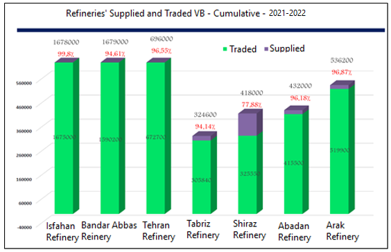 Fortunately, considering the database of the IME, the amount of VB traded in the country's refineries can be counted. Comparing to the year before, the statistics show the decrease of 13% in VB deal in IME, so that 6,308,000 tons of VB deal in 2020-2021 has decreased to 5,508,000 tons with reduction of 800,000 tons. Tehran refinery with a decrease of 36% and then Bandar Abbas refinery with a 20% decrease in the amount of VB traded in the IME, had the largest share of this decrease in the amount of VB reduction.