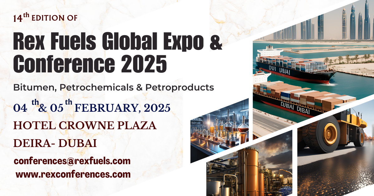 The 14th Edition of the Rex Fuels Global Expo & Conference 2025 scheduled on the 4th & 5th of February is set to be a landmark event, bringing together industry leaders, innovators, and decision-makers from across the Bitumen, Petrochemicals, and Petroproducts along with Shipping & Logistics sectors. Hosted at the prestigious Crowne Plaza Deira, Dubai, this premier conference will serve as a catalyst for industry advancements, strategic partnerships, and high-value business opportunities.
